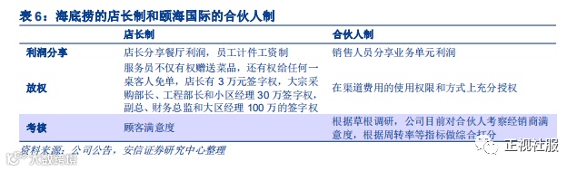 主观能动性发挥:店长制vs合伙人制。在门店扩张亟需人才背景下,海底捞选择了店长制,利润分享方面,店长分享店内利润,员工采取计件工资制,充分调动员工积极性;放权方面,海底捞的服务员不仅有权赠送菜品,还有权给任何一桌客人免单,店长有3万元的签字权,大宗采购部长、工程部长和小区经理有30万的签字权,副总、财务总监和大区经理有100万的签字权,给予员工主观能动性发挥空间;考核方面,不考核硬性KPI,只考核顾客满意度,明确努力方向。