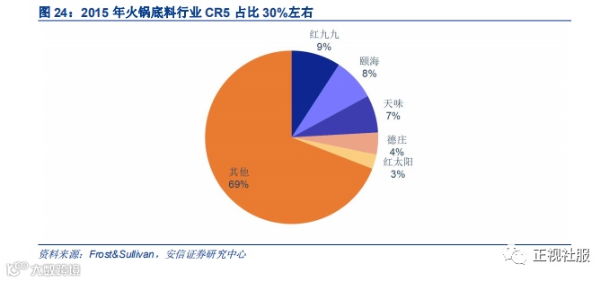 火锅底料市场CR5占比30%,集中度有待提升。火锅底料行业中,红九九、颐海国际、红太阳和天味食品等企业入局较早,规模较大。红九九1993年进入火锅底料行业,草原红太阳2003年成立,颐海国际业务最早可追溯至2005年,天味食品2007年入局。从2015年市占率来看,红九九占比9.2%,颐海占比7.9%,天味食品占比7%,CR5合计占比30%,市场集中度尚存提升空间。