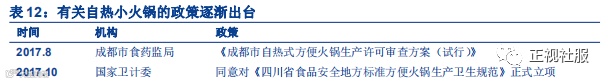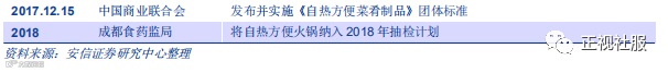 随着行业标准逐渐完善及消费者回归理性,市场面临洗牌,市场集中度有望提升。方便火锅作为一个新兴品类,目前尚无统一的国家标准和行业标准,目前各品牌方便火锅的执行标准五花八门,重庆麻辣多拿自热火锅蔬菜包标准SB/T10439-2007,火锅底料无执行标准,三只松鼠自热小火锅整体执行Q/FYCS0023S。目前市场尚处于孕育期,行业标准未规范导致入行门槛极低。地方已经开始探索方便火锅生产标准,2017年8月23日,成都食药监局发布成都市自热火锅生产许可审查方案,同年12月自热方便菜肴团体标准发布。随着行业逐渐走向规范,自热小火锅市场中质量不稳定的小企业将加速退出市场。另一方面,自热小火锅从火爆之初走的就是“网红”路线,吸引众多消费者“尝鲜式”消费,随着时间推移,消费者尝鲜需求得到释放,消费人群将回归理性,更加关注小火锅本身的品质和口味,大品牌自热火锅有品牌背书将更加受到消费者青睐,中小企业加速出清。