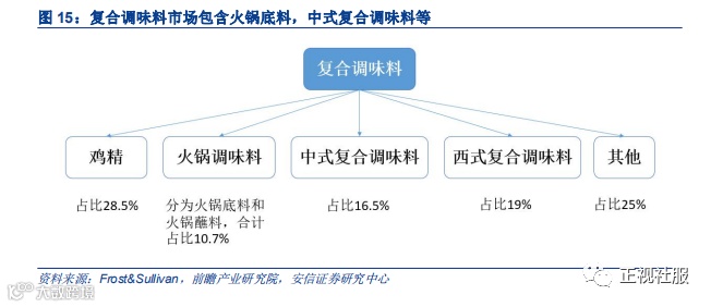 复合调味料市场包含鸡精,火锅底料,中式复合调味料等。区别于只含有一种主要原材料的单一成分调味料,复合调味料指两种或者以上原材料制成的调味料,典型的复合调味料包括火锅调味料,中式复合调味料,鸡精,西式复合调味料及其他。根据前瞻产业研究院的数据,2018年复合调味品市场鸡精占比最大,为28.5%,中式复合调味料占比16.5%,火锅调味料占比10.7%,火锅调味料又可细分为火锅底料和火锅蘸料,火锅底料为主。