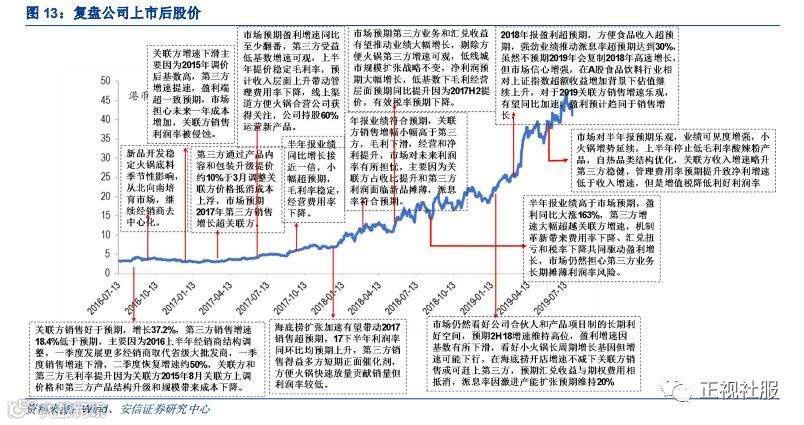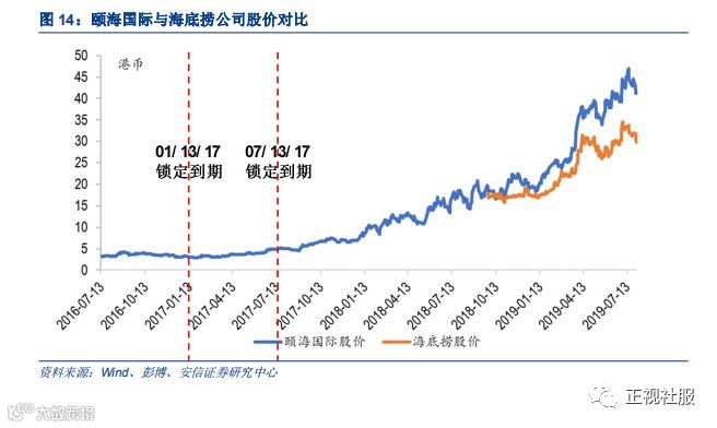 公司 IPO 后股权解禁时间分别为 2017 年 1 月 13 日和 2017 年 7 月 13 日,1 月份到期日股 价处于下行趋势,而 7 月份锁定到期时股价反而上升。由于公司处于海底捞产业上游且关联方销售额占收入比接近一半,公司的业绩与海底捞经营状况(同店增长和开店扩张)关系紧密,虽然 2018 和 2019 年资本市场开始将关注点从关 联方业务转向多元化的第三方销售增速,但是从海底捞上市后和颐海国际的股价也可以看到,两者在资本市场的表现也具备一定的一致性。