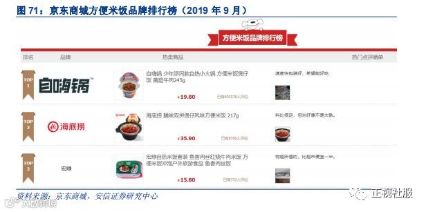 公司除了自热小火锅,还有方便米饭等食品单品尚在孕育当中,目前已有 3款口味(红烧风味牛肉,咖喱风味牛肉和腊味双拼煲仔)开启线上试销,从京东商城 2019 年 9 月方便米饭 品牌排行榜来看,海底捞腊味双拼煲仔风味米饭排行第二。随着公司产品项目制下更多单品 的培育,能力边界不断扩展,休闲食品市场未来发展空间可期。