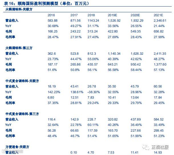 2)中式复合调味料:中式复合调味料主要销售渠道为第三方。过去几年对第三方销量增速稳定,随着公司不断加强第三方业务,预计19-21年第三方业务销量1238.1万KG/+39.88%,1686.6万KG/+36.2%,2144.1万KG/+27.1%,受益于海底捞门店持续扩张,预计19-21年对关联方销量为117.9万KG/+22.4%,144.2万KG/+22.3%,173.3万KG/+20.1%;中式复合调味料业务对关联方提价较为明显,预计19-21年每kg提价2.3/1.6/3.2元,对第三方每kg提价0.07/0.05/1.3元。