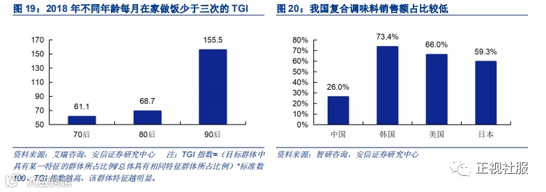 生活节奏更快的 90 后偏爱复合调味料。随着时代不断发展,90 后逐渐成为社会中坚力量。与上一代人相比,90 后做饭经验更少。根据艾瑞咨询的数据,2018 年不同年龄层级中,90 后每月在家做饭少于三次的 TGI 指数最高。同时现代年轻人生活节奏加快,对生活的便利性 要求提高。与单一调味料相比,复合调味料覆盖更多做饭经验较少的人群,符合生活节奏加 快的时代趋势。叠加我国人民生活水平不断提高,消费者购买力增强,复合调味料将逐步取代单一成分调味料。目前全球调味品市场中,国外复合调味料对传统调味料替代率超 60%, 中国仅为 20-30%。从复合调味料销售额占比来看,美国为 73.35%,韩国 65.97%,中国仅为 25.97%,未来我国复合调味料市场提升潜力较大。