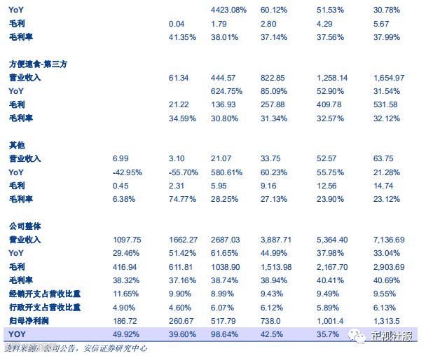 3)方便速食产品:主要指2017年推出的新品自热小火锅。该业务板块为公司重点发展领域,预计未来几年销量将保持高增速,19-21年对关联方销量为14.2万KG/+60.00%,21.4万KG/+50%,27.8万KG/+30%,对第三方销量为1988.6万KG/+85.0%,2982.9万KG/+50.0%,3877.7万KG/+30.0%。方便速食产品正处于导入期,预计20年以后会逐步明显提价。