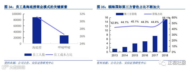 商业模式关键要素:人。相比于大多数餐饮企业以菜品为核心,海底捞最大的特点在于优质的服务,优质的服务需要服务员来提供,因此服务员是海底捞商业模式里的关键要素。截至2019H1,海底捞共有88378位员工,员工成本占比31.2%,同时期呷哺呷哺仅有27401名员工,员工成本占比26.5%,海底捞对人的因素依赖更大;颐海国际最早是海底捞集团火锅底料产品的内部供应商,随着规模的扩大逐渐向第三方经销商及餐饮服务商供应火锅底料产品,近年来更是加大发力第三方业务,不断提高第三方业务占比。与对关联方销售的业务模式相比,对第三方销售的生产和研发方面变化不大,最大的转变在于销售渠道,第三方渠道需要销售人员的开拓和维护,因此销售人员在颐海商业模式中的重要性逐步体现。