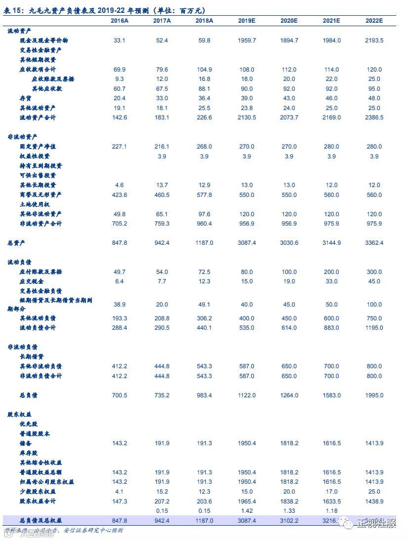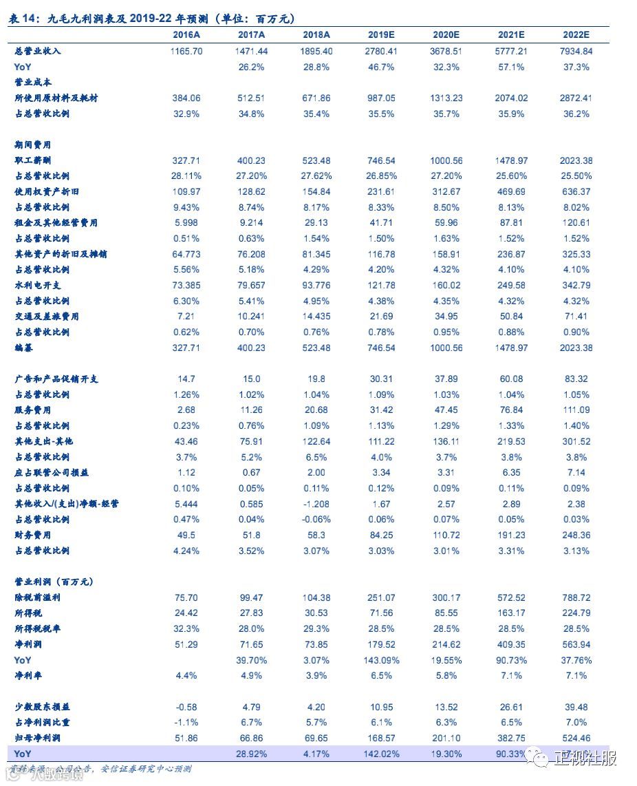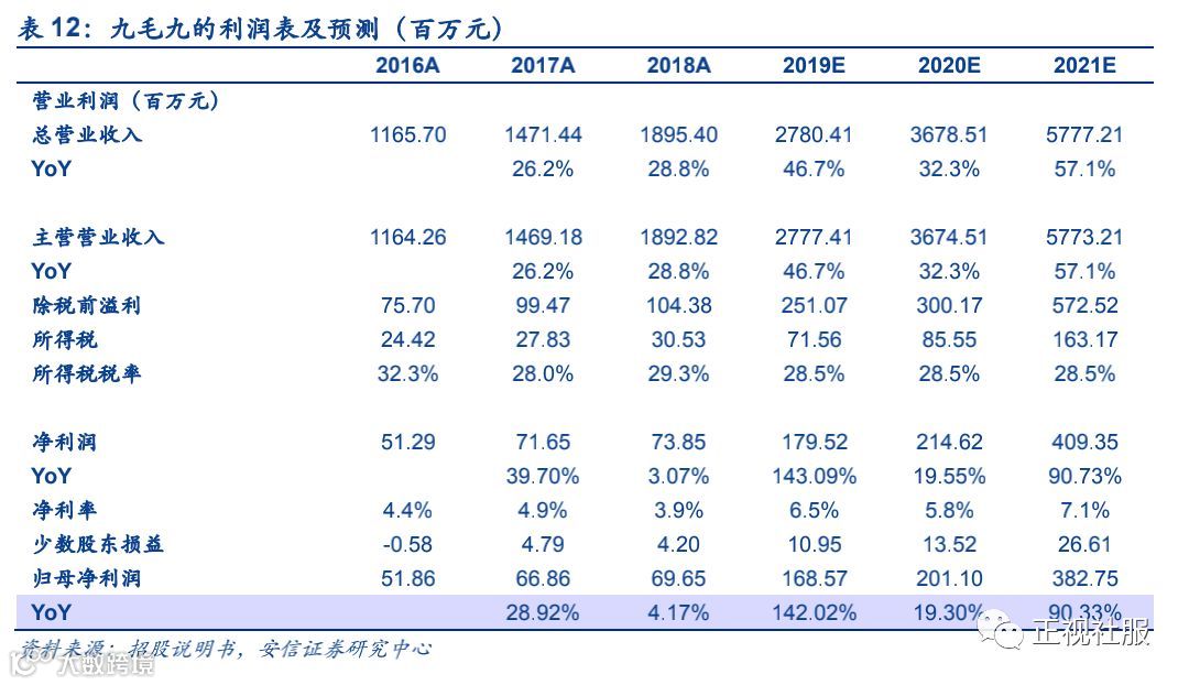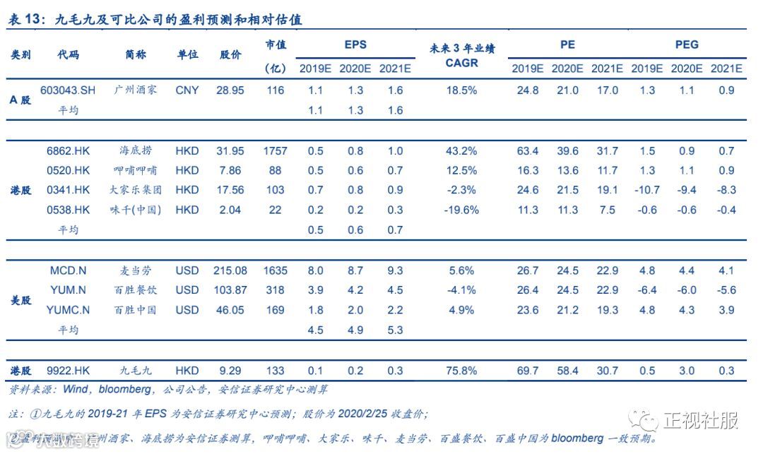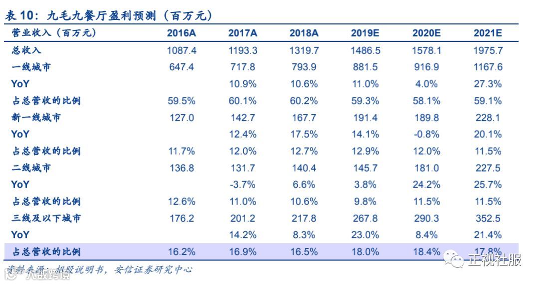 2)九毛九经营预测:预计九毛九餐厅19-21年营收复合增速14.4%,有望从2018年的147门店对应的13.2亿元营收(预计期间累计新开店60家,关店6家),增长至2021年201家门店的19.8亿营收。其中,一线城市是未来扩张的重点,对应19-21年复合增速达13.7%,新一线、二线和三线及以下城市基数较小,门店营收复合增速预计分别为10.8%/17.5%/17.4%。