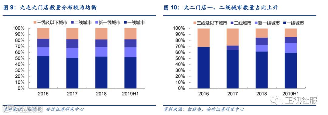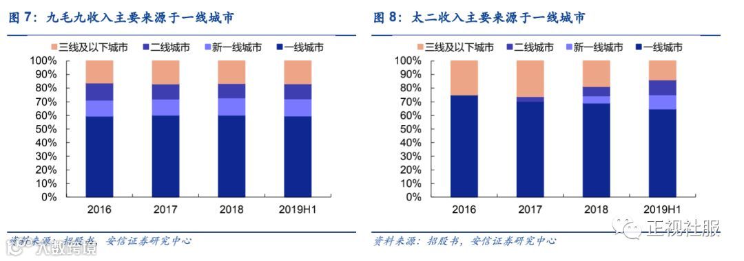 太二门店扩张重点在一线&新一线城市,九毛九门店分布更为均匀。一线城市为太二的重心,扩张速度快,2016年一线城市门店数为9家,截至2019年H1一线城市门店数达54家,占比达59%。新一线城市门店数量快速增长,2018年7家,2019H1达到15家,占比16%。2019年H1,一线及新一线城市门店贡献收入4.04亿元收入,占比75.2%。九毛九扩张速度平稳,2016年门店数为128家,2019年H1门店数达144家,增速平稳。门店主要分布于一线城市,但在二、三线城市数量分布较太二更为均衡。截至2019年上半年,一线城市门店数75家,占比52%,其他城市层级占比均在13-18%范围内。