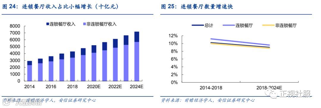 领先企业、连锁餐厅具有更强的市场竞争力,品牌化、连锁化成为餐饮行业趋势。餐饮市场规模大,以独立运营的餐厅为主导,但由于连锁餐厅具有强大的品牌曝光度,更大的业务规模和客户群,以及中央厨房在食品供应和运营标准化方面的优势,保证了产品质量及餐厅翻台率,迎合了消费者期望并提升餐厅经营效率,因此品牌化、连锁化逐渐成为趋势。2014-2018年,连锁餐厅于整个餐饮市场的收入占比由18.8%升至19.5%,预计2024年,连锁餐厅收入占比为20.1%,连锁餐厅市场占比小幅增长。受益于整体餐饮市场的高速增长,连锁餐厅收入将继续保持增长。消费者对品牌声誉、食品安全、餐厅服务等各方面的重视程度愈来愈强,预计连锁餐厅数量的增长将超过非连锁餐厅。拥有完善供应链体系、标准化流程及资本支持的领先企业具有更强的市场竞争优势。根据公司招股书,2018年前100大企业合计实现收入2410亿元,较2017年增长12.2%,超过行业整体增长率。
