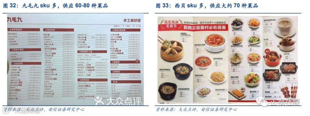 西北菜sku较多,口味品质受厨师手艺影响大。定位家庭聚餐的西北菜,为顾客提供更多菜品选择,菜品种类丰富,与传统中餐厅类似,西北菜制作对口味的把控更依赖厨师的技术。西北菜领先企业西贝莜面村共提供70道左右的菜品,而九毛九则提供60-80道菜品。