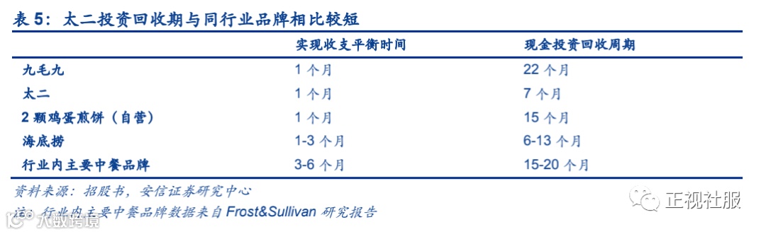 3)投资回收期短:1个月收支平衡,7个月现金投资回收,投资回收能力行业领先。单店回收期方面,太二餐厅一般运营满一个月实现收支平衡,7个月现金投资回收;海底捞一般1-3个月盈亏平衡,6-13个月现金投资回收。餐饮行业内主要的中餐品牌通常3-6个月实现盈亏平衡,15-20个月实现现金投资回收,太二的投资回收能力处于行业较高水平。太二酸菜鱼单店回收期短原因为:①餐厅面积较小,一般为200-300平方米,单店投资成本低,根据招股书公布的扩张计划中,平均每家太二餐厅的投资成本约为250万元。②餐厅目前尚处于扩张初级阶段,一线城市还有很大扩展空间,口味+营销双重作用下客流量大,翻台率数据表现优异。