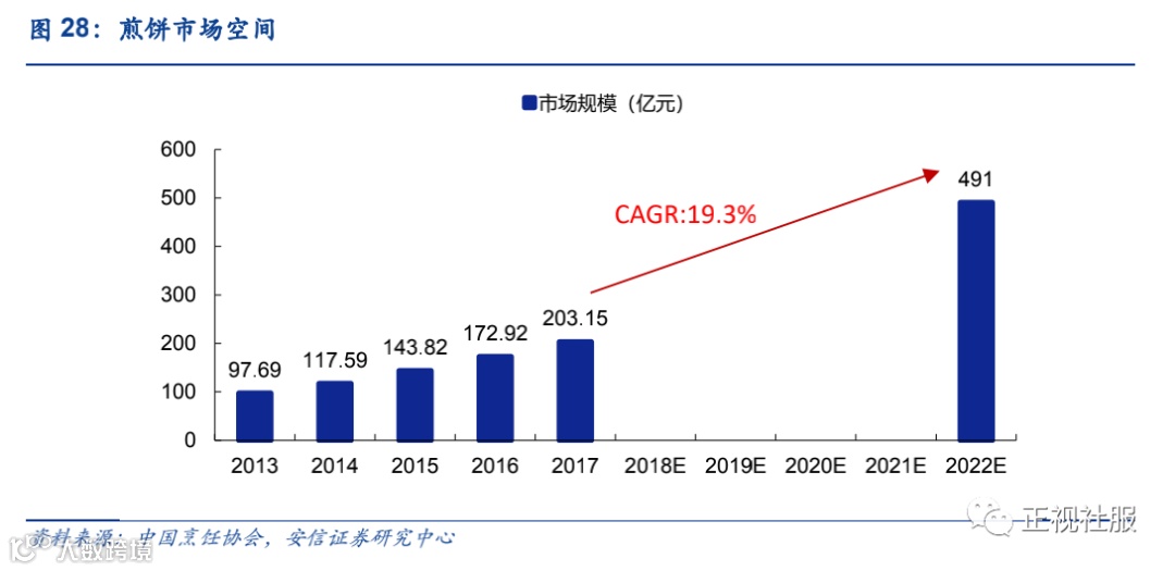 全国煎饼市场规模17年203亿元,2018~22年预计增速19.3%同为较高成长赛道之一。2017年我国煎饼市场规模达到了203.15亿元,同比2016年增长了17.49%。预计到2022年,我国煎饼市场的规模将达到491亿元,CAGR达19.3%煎饼市场进入壁垒相对较低,市场竞争格局极其分散,同质化极其严重,煎饼作为高频度重复消费,市场经营者以街头小摊、小店模式为主。随着消费者的需求越来越多样化,对就餐环境卫生等方面要求的提升,连锁化煎饼店在品牌维护、卫生管控方面具有更强的竞争力。