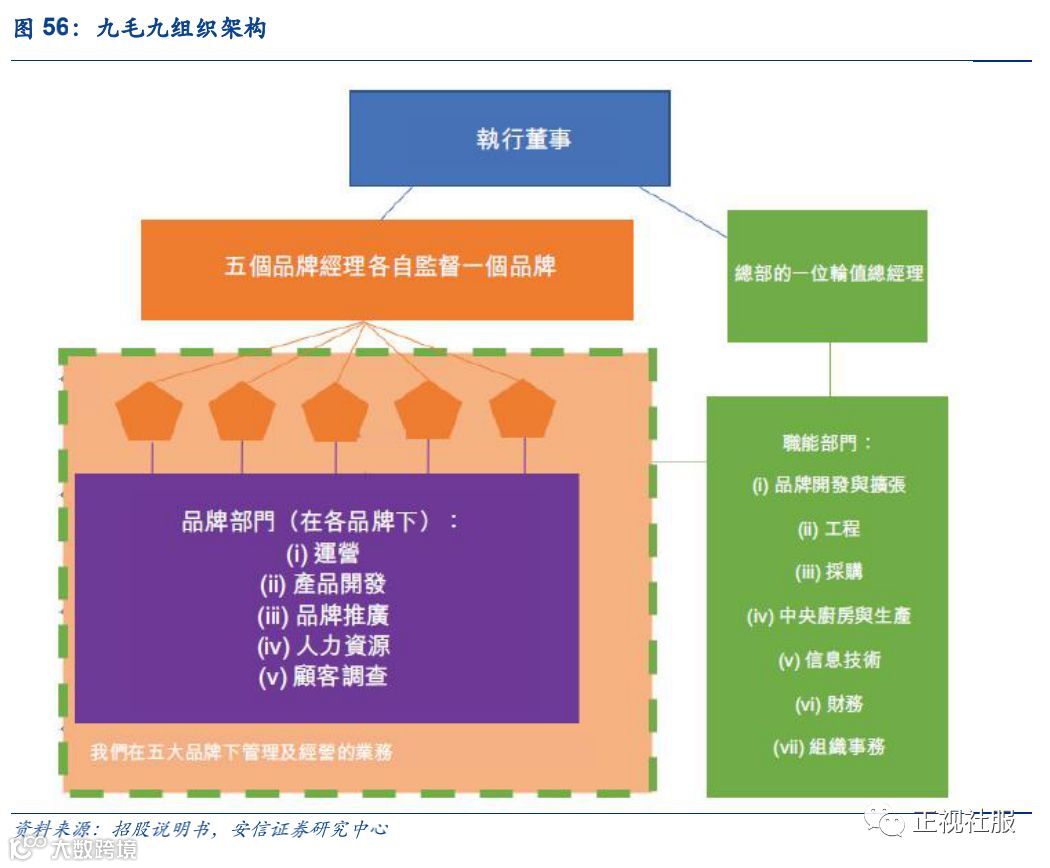 组织架构灵活,实现标准化的同时促进公司运营管理创新。公司管理架构为在集中的指挥管理下,五个品牌经理各自监督一个品牌,实现各品牌并行运作。公司总部设有7个职能部门,分别负责品牌的开发、扩展、采购及中央厨房等组织事务,通过高度标准化保障公司产品品质。在职能部门协助下,各品牌团体专注于各自目标客户的需求,开发和改进符合市场趋势的菜品,从而实现各品牌动态的运营创新。
