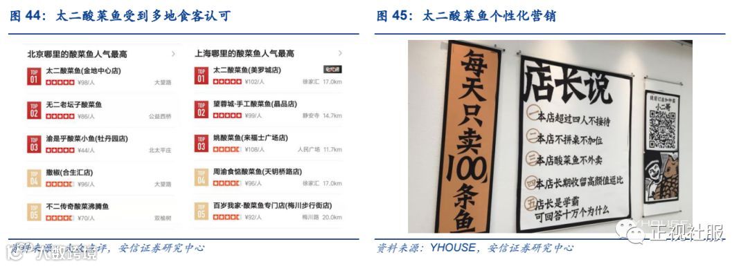 2)模式新:口味为核心壁垒,同时进行个性化反向营销,强化传播效应。①口味是太二的核心壁垒:酸菜鱼是太二的核心产品,为打造优质酸菜鱼,公司组建专业研发团队,对比各种鱼类,挑选出最适合做酸菜的加洲鲈鱼。因鱼肉口感差异难以形成壁垒,太二将重点放在酸菜上,以“酸菜比鱼好吃”为目标,坚持自己采用传统方法腌制酸菜,模仿重庆地窖环境,并选用天然泉水来制作盐水,使酸菜口感脆爽,酸味达标。太二餐厅的酸菜鱼受到多地食客认可,入选大众点评多地酸菜鱼排行榜top1,口味成为太二餐厅的核心壁垒。②以口味为支撑,反向营销强化传播效应:市场上的餐厅通常都在想办法迎合顾客,讨好顾客,而太二的品牌文化却在“强势”的制定自己的规矩,反向营销进入顾客心智,通过店内店外的标语、“规矩”,不仅解释了自己在服务和菜品选择上的“招待不周”,还反向引发传播效应。反向营销优点在于容易引起消费者关注,且符合90后个性化趋势,但必须有核心竞争力作为支撑效果才能持续。餐厅通过店内黑白漫画装修风格、“太二太傻店老板”的品牌故事、“对暗号”等个性化方式传播品牌文化,借助在“好口味”的背后支撑下,引发口碑效应,提高餐厅知名度并带来源源不断的客流。