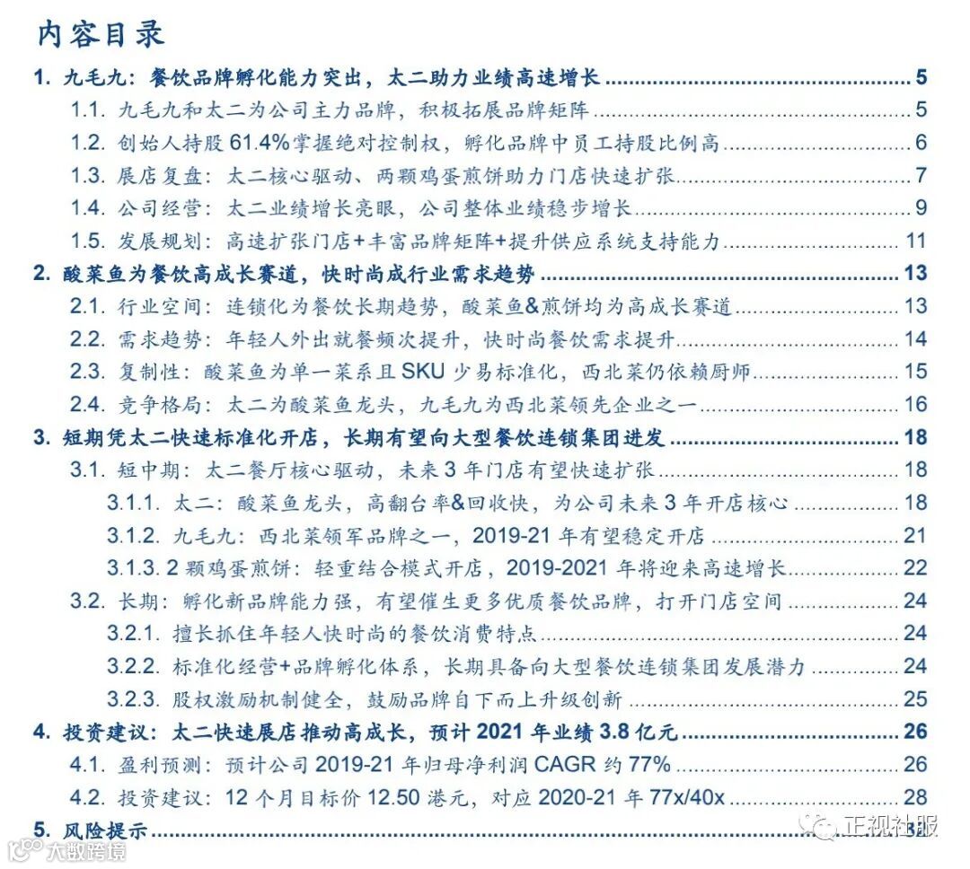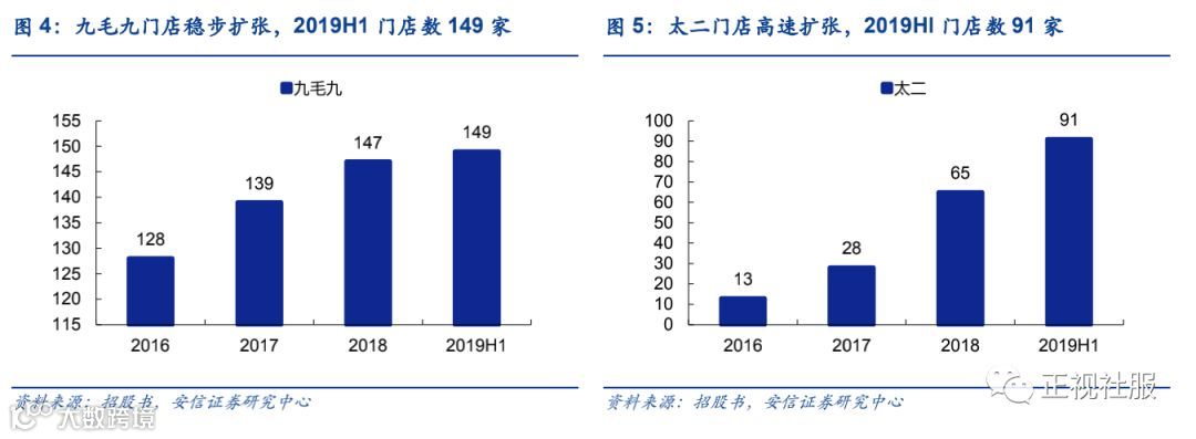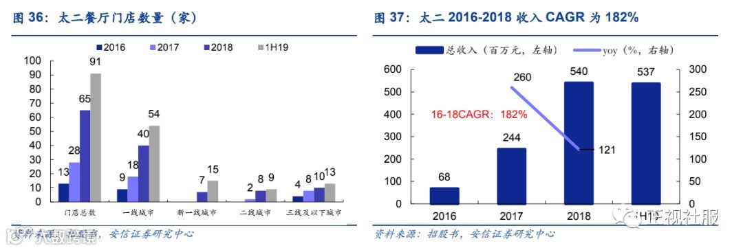 ■成长性:短中期在IPO募资下以太二等餐厅标准化复制扩张,长期有望进军大型餐饮连锁集团。1)短中期门店扩张:①太二:系酸菜鱼餐厅市场龙头,市占率行业第一(据招股书)。太二凭借翻台率高(1H19为4.9台)、投资回收期短(1个月收支平衡、7个月现金投资回收)、模式新(个性化反向营销,强化传播效应)使得标准化复制能力强,在2019-2021年期间将以一线和新一线开店为核心,计划分别新增太二餐厅60/80/100家,对应公司当年新开店总数的65%/66%/64%。②九毛九:西北菜领军品牌之一,为公司最早创立的品牌,1H19门店数149家,2019-2021年计划新增16/18/20家。③2颗鸡蛋煎饼:2017年推出,以自营+加盟轻重结合模式展店,19年上半年自营/加盟各20/35家,各贡献总收入0.8%/0.4%,计划2021年自营/加盟门店增至62/300家。2)中长期进军餐饮连锁集团:公司标准化扩张和经营经验丰富,5个品牌并行运作,7个职能部门支持品牌运营,形成较成熟的品牌孵化体系;各品牌由独立团队负责,股权激励机制健全,长期看有望向大型餐饮连锁集团进军。
