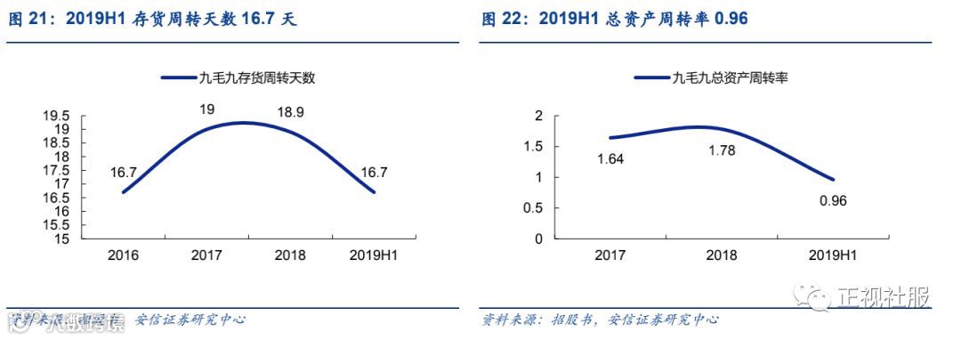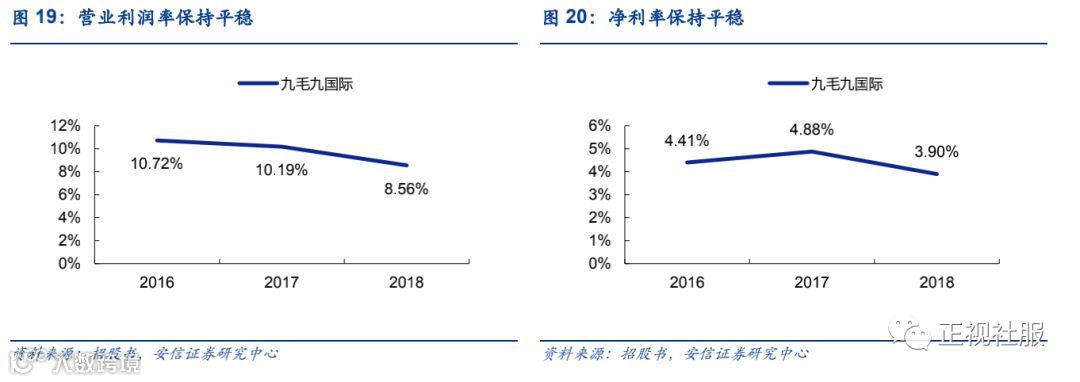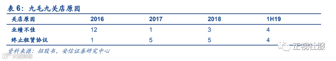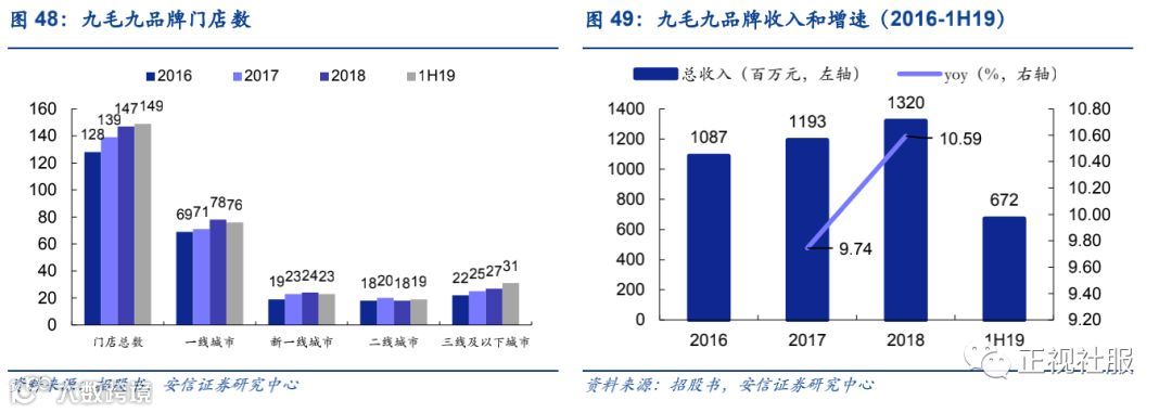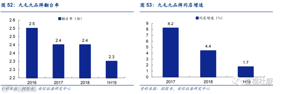 翻台率稳定,同店保持增长但增速下滑。九毛九品牌的翻台率1H19为2.3倍,较2016年的2.5倍有所下滑但基本保持稳定,1H19同店增长1.7%,增速较2017/2018年的8.2%/4.4%有所下滑,因此九毛九品牌的收入增长应主要关注外延以及关店调整情况。