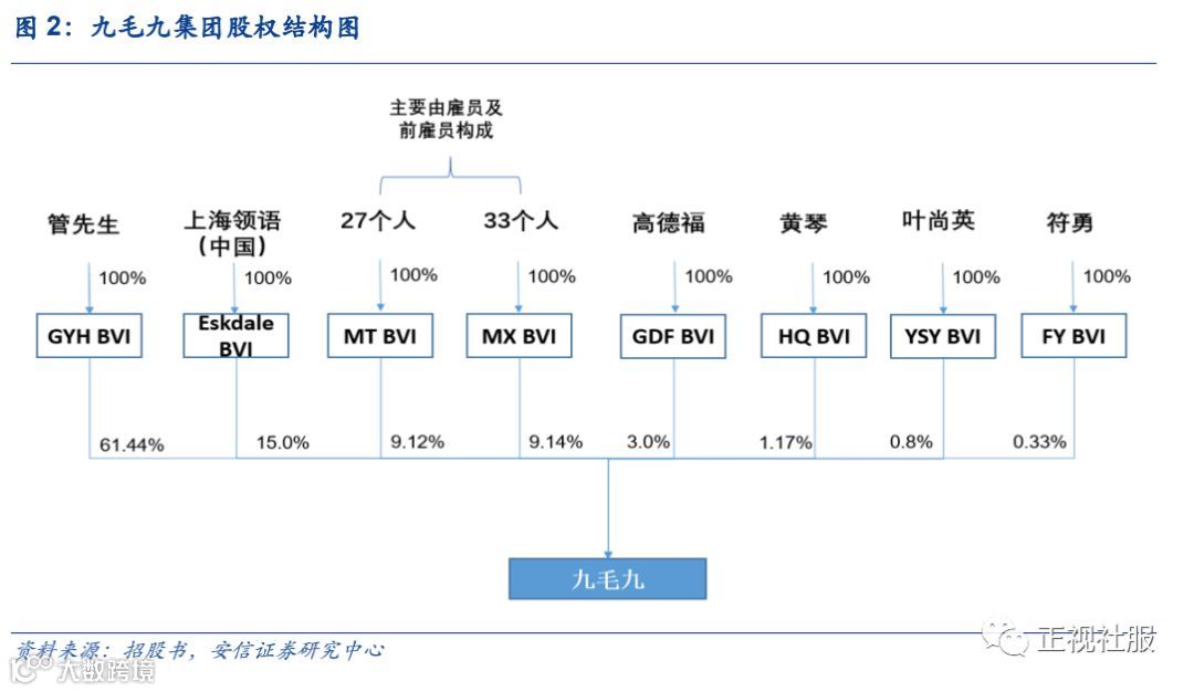 控制权集中,创始人管先生拥有绝对话语权,持有61.44%的股权。从股权结构看,九毛九曾在2014&2015年引入外部投资,实控人为创始人管先生,通过GYH BVI持有公司61.44%的股份,MT BVI的27个人中22名为公司雇员,5名为前雇员,MX BVI的33个人中,23名为公司雇员,9名为公司前雇员,1位位外部投资者。