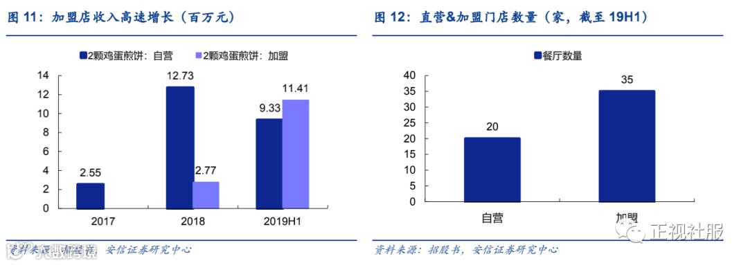 2颗鸡蛋煎饼是公司首次尝试加盟模式,雇员加盟商模式帮助公司快速实现门店扩张。加盟模式是餐饮品牌惯常采用的扩张手段。过去公司为保护品牌价值,旗下的餐饮品牌均为直营。2颗鸡蛋煎饼则是自营模式和加盟模式共存。为实现快速扩张,公司采用“雇员加盟商”模式,利用公司内部员工资源,鼓励管理层所选的员工成为加盟商或推荐合适的加盟候选人。在扩张初期,公司采用较为优惠的加盟条款,包括豁免加盟费和餐厅经营保证金,帮助2颗鸡蛋煎饼实现快速扩张,自2018年下半年开放加盟以来,截至2019年12月22日,公司已发放41张加盟商牌照。2018年及2019年上半年,源于雇员加盟商所经营的加盟餐厅占所有加盟餐厅收入的87.5%及67.5%。