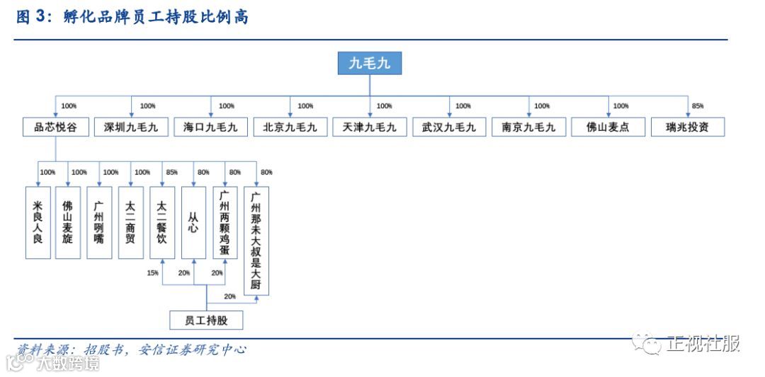 新品牌员工持股比例高,调动工作积极性,助力品牌孵化。2015年起九毛九陆续孵化了太二、怂、广州两颗鸡蛋、那未大叔四大新品牌,均设置了较高的员工持股比例,其中太二为15%,怂、两颗鸡蛋、那未大叔均为20%。较高的员工持股比例,有助于带动员工积极性,在新品牌孵化的过程中,品牌经营好坏与员工自身利益高度挂钩,因此员工为努力品牌经营出谋划策,积极运营,有助于品牌的成功孵化。