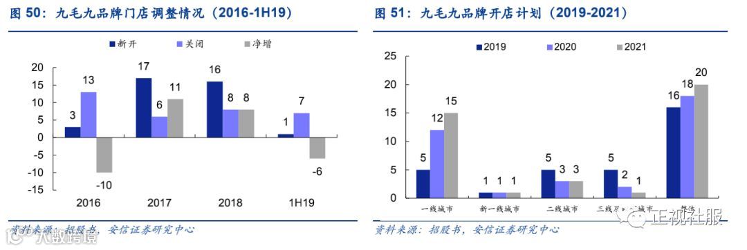 九毛九品牌未来3年将持续开店,展店以一线城市为主。截至1H19,公司九毛九品牌门店数为149家,自2016年以来净增21家,虽展店速度不及太二,但也保持稳定开店态势,公司计划2019/2020/2021年新开九毛九门店16/18/20家,九毛九门店的现金投资回收期通常为22个月。截至1H19,九毛九一线城市门店占比为51.01%,新一线及二线城市门店占比为28.19%,三线及以下城市门店占比为20.81%,九毛九2019-2021年开店将以一线城市为主,2019-2021年计划新开门店中一线城市门店占比为59%。与太二餐厅不同,九毛九品牌餐厅存在业绩不佳关店调整的情况,而太二餐厅仅2017年因租赁协议终止关闭一家门店。