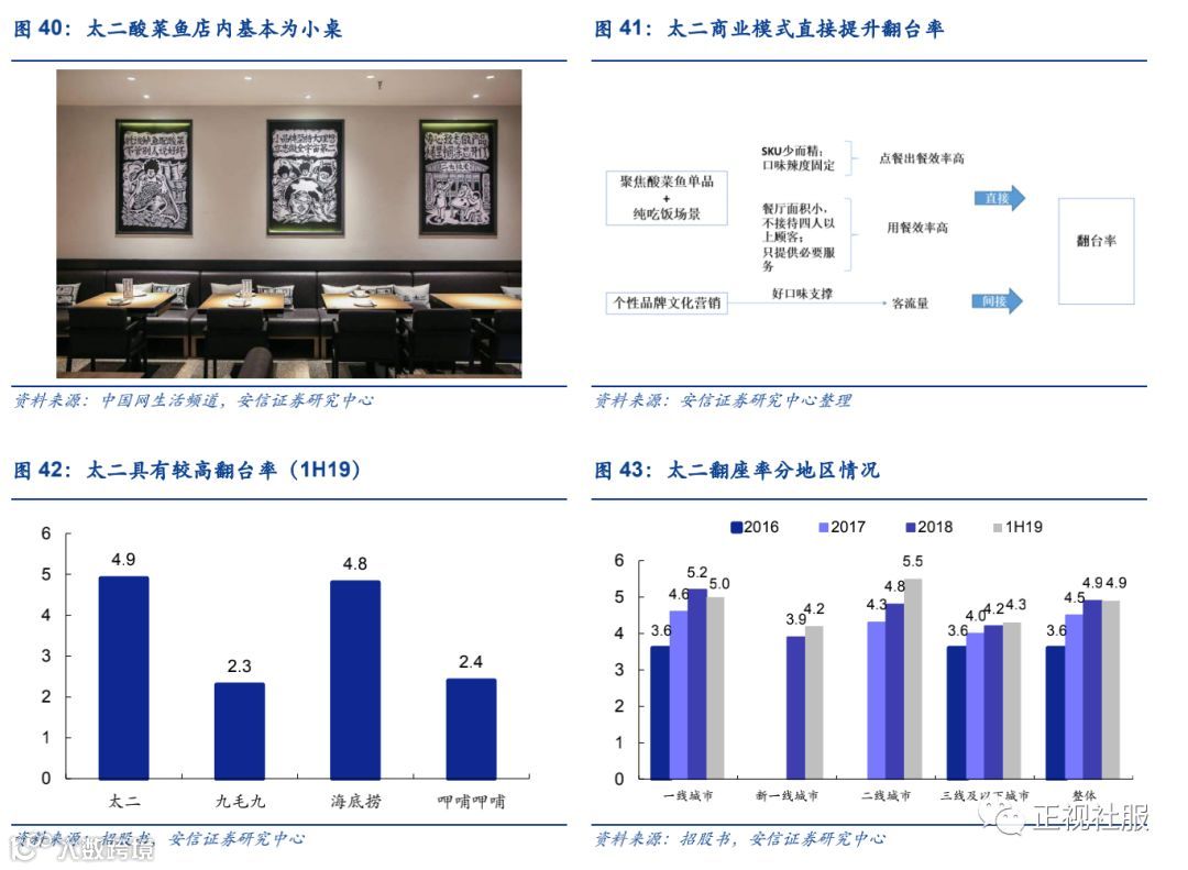 1)翻台率高:精简SKU+弱化社交,“快”商业模式推高翻台率。太二的翻台率自2016年以来不断提升,由2016年的3.6倍增至1H19的4.9倍,与同业公司相比,太二翻台率较高,主要因为聚焦酸菜鱼单品+定位纯吃饭场景,直接提高点餐出餐用餐效率:①以酸菜鱼为特色,少SKU提高点餐出餐效率:太二最大的竞争力是酸菜鱼单品,菜品SKU少而精。为保证产品品质和口味,餐厅贯彻“少即是多”的理念,店内主菜提供一种酸菜鱼,由小、中、大三个分量选择,并且口味和辣度固定,让专业团队决定菜品口味,只提供大概率的最优解给客户,不加辣不减辣不做外卖。酸菜鱼之外,店内只供应不多于23种的其他菜品,极为精简的SKU不仅简化顾客选择,并且降低后厨准备难度,提高点餐及出餐效率。②弱化社交,简化服务,提高用餐效率:太二定位纯吃饭场景,弱化用餐社交功能并简化产品外的其他服务。太二店面都开在大型购物中心,餐厅面积介于200-300平方米,大约有33张餐桌容纳110位顾客。来购物中心逛街的人2-4人居多,同时餐厅规定不接待四人以上就餐,弱化餐厅社交功能,让顾客能专心享用菜品,在保证顾客吃鱼体验的同时,也提高了顾客的用餐效率。为打造简单的纯吃饭场景,太二还取消了除产品以外的各种收费,同时将服务简化,倒水也要顾客自助。餐厅2015年就实现了微信闭环点餐,前后台完全打通,可实现通过手机扫码点单、厨房自动出单、自动上菜、扫码买单、发票等一系列流程,减少人工服务成本,提高餐厅服务效率。