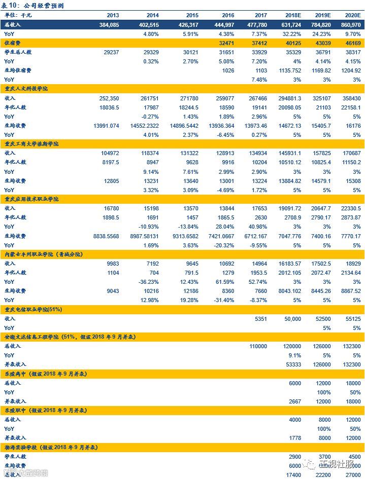 根据我们对各校的经营预测,预计公司2018-2020年的收入分别为6.31亿元/7.84亿元/8.60亿元,对应增速32.22%/24.23%/9.70%;归母净利润分别为3.21亿元/3.62亿元/3.93亿元。