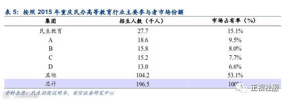 重庆民办高校市场高度集中。2016年,全市公办普通本科高校17所、民办本科高校8所,在渝军校3所。根据弗若斯特沙利文报告,2016年,重庆五大民办高等教育市场参与共占约46.9%的市场份额。民生教育集团在重庆的市场占有率在2015年居首位,约占15.1%的市场份额。
