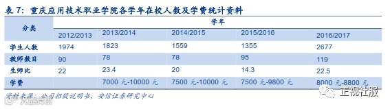 2013至2017年学校在校生人数由1974名增至为2884名,CAGR为9.94%。学费由2013的 7000元—10000元逐年调整至2017年的8000元—8800元,学费每年调增幅度不大。学校2013年至2015年的毛利率分别为56.1%、46.3%、26.6%,2016年前十个月毛利率为1.3%。