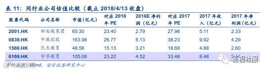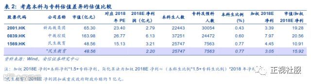 根据以上分析,我们认为应对本科和专科给予不同估值,本科估值应为专科估值的1.5倍左右。故引入加权2018E净利=本科净利*1.5+专科净利,简化算法为加权2018E净利≈(本科生比例*1.5+专科生比例)*2018年净利。