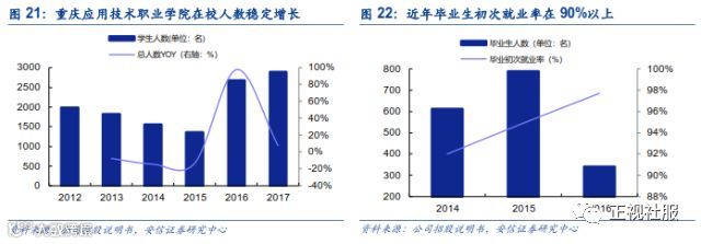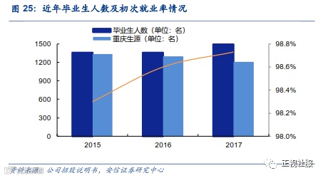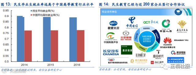 学生就业率远高于全国平均水平。根据弗罗斯特沙利文报告,2013至2015年中国高等教育行业整体平均初次就业率为77.4%、77.5%、77.7%比较,公司2014至2016年初次就业率分别约为90.2%、91.1%及88.9%。2017年学校为毕业生举办招聘会、双选会200余场,接待用人单位1000余家,学校28个专业年终就业率100%。相对较高的初次毕业生就业率表明集团良好的教育成果,并将继续提升品牌认知度及吸引优秀学生民生教育已经与近200家企业签订合作协议,保障学生能找到实习并顺利就业,其中包括华为、中国电信、长安汽车等知名公司。重庆人文科技学院新建了创业孵化基地,多项创业项目分别获得区县、省市级、国家级奖励。