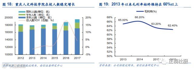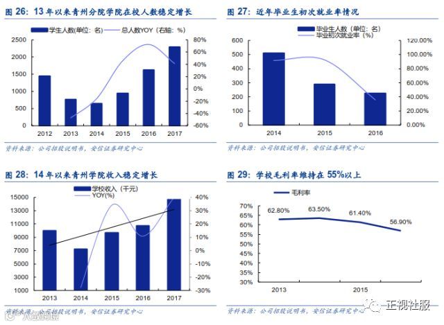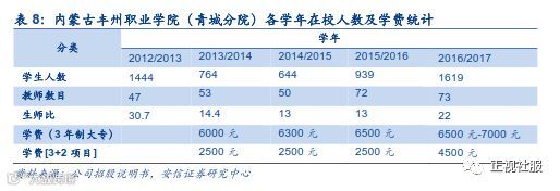 青城学院15年到17年学生人数增长较大,专科生学费稳定增长,[3+2]项目学费大幅上涨。学生2013至2017年学校在校生人数由1444名增至为2288名,CAGR为12.2%。专科学费由2013的6000元逐年调整至2017年的6500元—7000元,学费每年调增幅度不大。[3+2]项目(三年中等职业教育后参加国家统招考试以继续接受高等职业教育项目的五年职业研究项目)学费由2016年的2500元调增至2017年的4500元,上调幅度较大。学校2013年至2015年的毛利率分别为62.8%、63.5%、61.4%,2016年前十个月毛利率为56.9%。