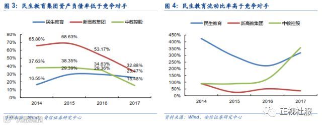 民生教育集团资产负债率远低于新高教集团及中教控股,偿债能力较强。2014至2017年民生教育资产负债率分别为16.55%、29.39%、29.36%、25.47%,而同期新高教集团资产负债率为65.8%、68.63%、53.17%、32.88%,中教控股资产负债率为37.63%、38.35%、34.63%、15.48%。