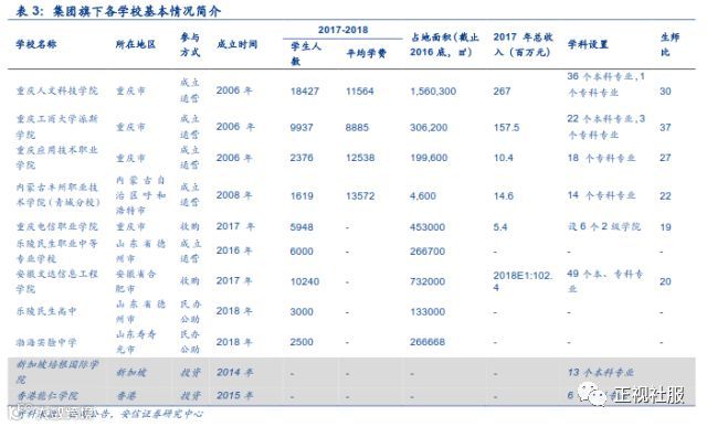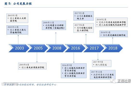 2017年3月,公司在香港联交所上市,此后由于法律限制,公司以协议控制的方式进行扩张收购。2017年8月收购安徽文达信息工程学院,11月收购重庆电信职业学院,并于12月实现并表;2017年9月,公司以较短的时间即被纳入港股通,进一步提高了流动性。2018年起,公司开始在山东省内探索高中教育,2018年2月成立乐陵民生高级中学,并于3月收购渤海实验中学全部举办者权益。