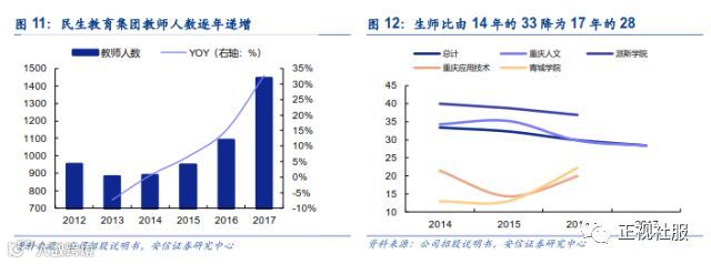 集团师资力量雄厚,生师比下降、保障教学质量。教师人数由2013年的953名增长为2017年的1446名。约87.4%教师拥有学士及学士以上学位,约52.6%教师拥有硕士及硕士以上学位。多名教师被视为双师型教师,既有教学经验亦曾在相关企业工作。集团学校生师比由2014年的33.4降为2017年的28.4,进一步保障教学质量。