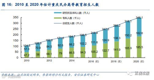 重庆民办高校招生人数的CAGR远高于中国西部平均水平,为中国西部地区最高。根据弗若斯特沙利文报告,2010年至2015年,重庆民办高等教育的总招生人数由10.45万人增长至19.65万人,CAGR约为13.5%,预计2020年重庆民办高等教育的总招生人数将达到34.81万,CAGR约为12.1%。