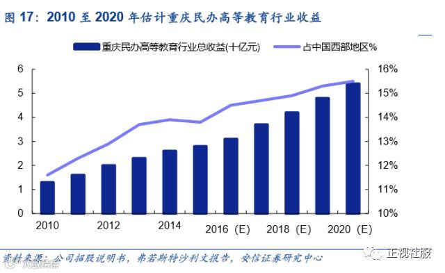 重庆民办高等教育收益年复合增长率远高于西部地区平均水平且占比不断扩大,中国西部地区民办高等教育收益占全国比例也在不断扩大。根据弗若斯特沙利文报告,重庆民办高等教育收益由2010年人民币13亿元增长至2015年人民币28亿元,CAGR为17.0%。预计2020年的重庆民办高等教育总收益将达至人民币54亿元,CAGR为14.4%。