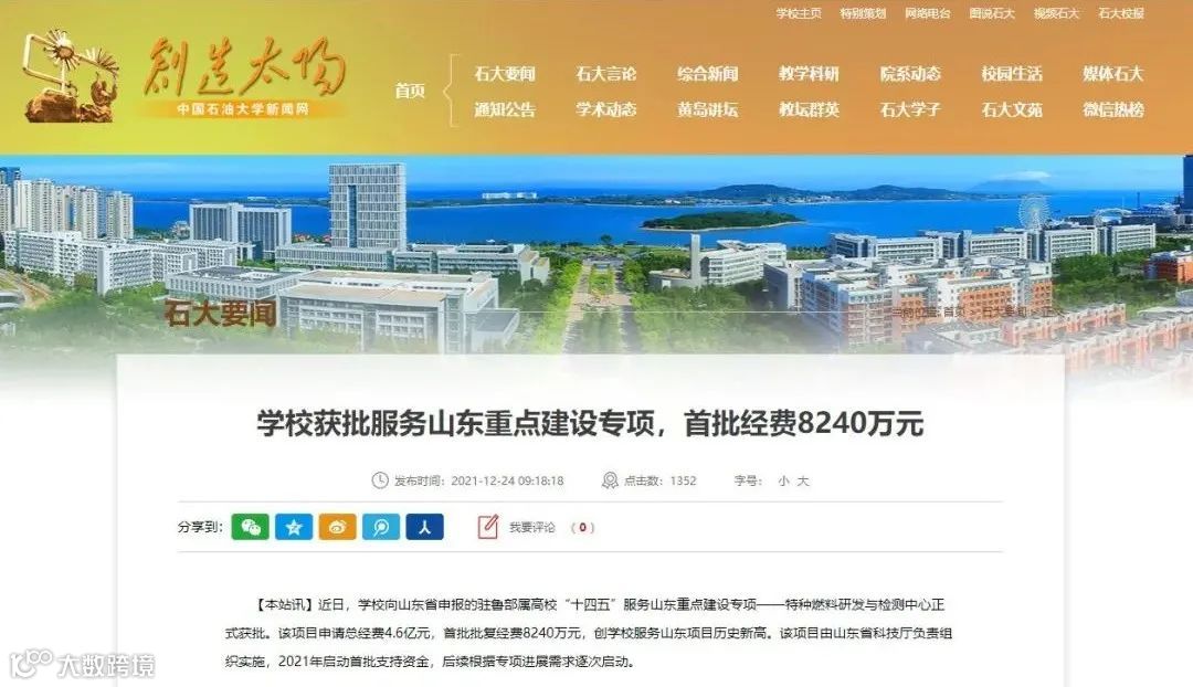 近日,中国石油大学(华东)向山东省申报的驻鲁部属高校“十四五”服务山东重点建设专项——特种燃料研发与检测中心正式获批。该项目申请总经费4.6亿元,首批批复经费8240万元,创学校服务山东项目历史新高。该项目由山东省科技厅负责组织实施,2021年启动首批支持资金,后续根据专项进展需求逐次启动。