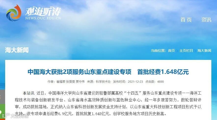 中国海洋大学向山东省建议的驻鲁部属高校“十四五”服务山东重点建设专项——海洋工程技术与装备创新研发平台、山东省海水高效种质创新与蓝色种业中心,经一年多艰苦努力,数轮答辩评审,成功获批落地,正式纳入山东省科技创新发展资金支持计划,以山东省重大科技创新工程项目形式予以支持。该专项申请总经费6.9亿元,首批批复1.648亿元,创学校服务地方项目历史新高。专项建设期为五年,由山东省科学技术厅负责组织实施,2021年启动首批支持资金,后续根据专项进展需求逐次启动。
