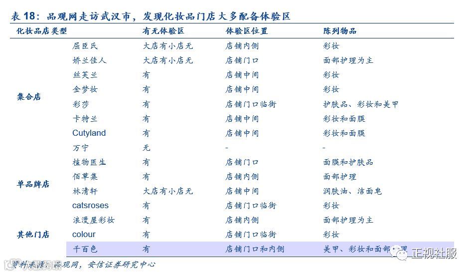 低线城市化妆品门店更为注重配套服务。低线城市化妆品店内的试妆台已经成为门店标配,大多数的门店直接把试妆台摆放在彩妆区域,为此方便顾客提供试妆化妆卸妆等各方面服务。与此同此,连锁店内还开设了客户体验专区,配备设备有躺椅、美容床或是护肤仪器等等,为进店顾客提供了从洁面、敷面膜、护肤到化妆的全套的一条龙服务。除此以外,还有一些化妆品店都在增加免费修眉或是称体重等附加服务,目的也非常明显,以此来吸引更多的客流。唐三彩全国第一家智能美妆体验馆内也为消费者提供皮肤检测以及头皮检测等多种服务体验。甚至有些门店采用“前店后院”(化妆品专营店+美容院)的模式,提升客户粘性、延长顾客停留时间。