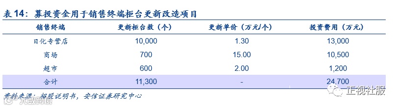 上市后,公司拟对现有日化专营店、商场和超市柜台等进行改造升级,进一步巩固公司产品在线下渠道的优势。渠道形象建设计划更新改造现有日化专营店柜台10,000个,商场柜台7,000个,超市柜台600个。项目建成后,将满足公司在线下渠道柜台的更新改造需求,加大品牌宣传力度,提升公司品牌知名度和影响力。