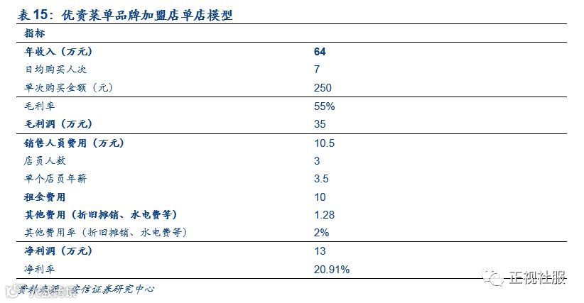 对于加盟商而言:假设日均购买人次约7位、客单价250元,则单店年收入约为64万元;根据我们的测算,单品牌加盟店净利率可达近21%,对加盟商具有十足的吸引力。