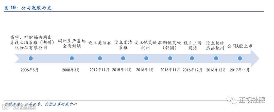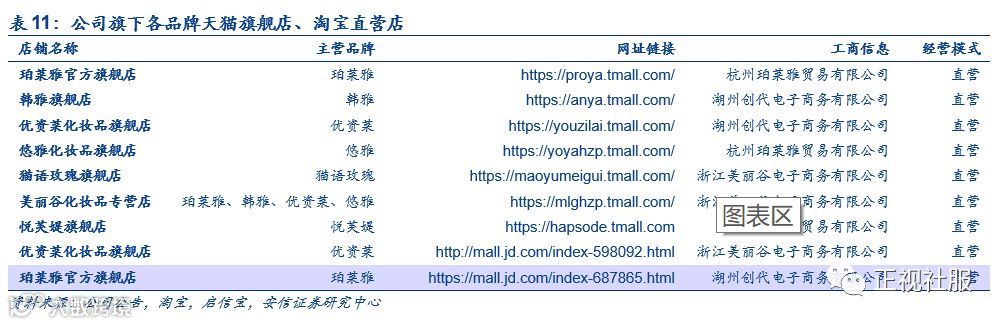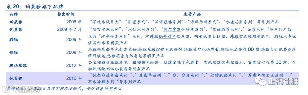 此外,韩雅、悠雅、猫语玫瑰、悦芙媞等品牌为公司贡献收入占比较低,为培育期品牌,公司意图以此类特色品牌攻占化妆品细分市场(韩雅定位为药妆,悠雅、猫语玫瑰、悦芙媞定位为特色少女彩妆)。