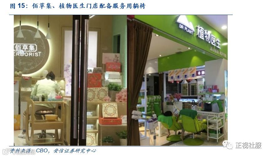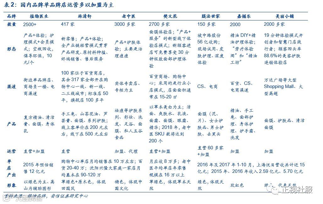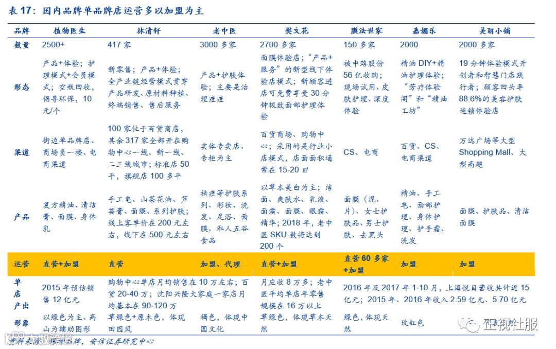 国内品牌单品牌店运营多以加盟为主。2017年植物医生单品牌店已达两千家,林清轩已开设417家单品牌直营店。同时,以中医为亮点差异化的老中医已开出3000多家门店,以面膜为切入的樊文花开出2700家门店,打绿色平价护理的美丽小铺开出2000多家门店。