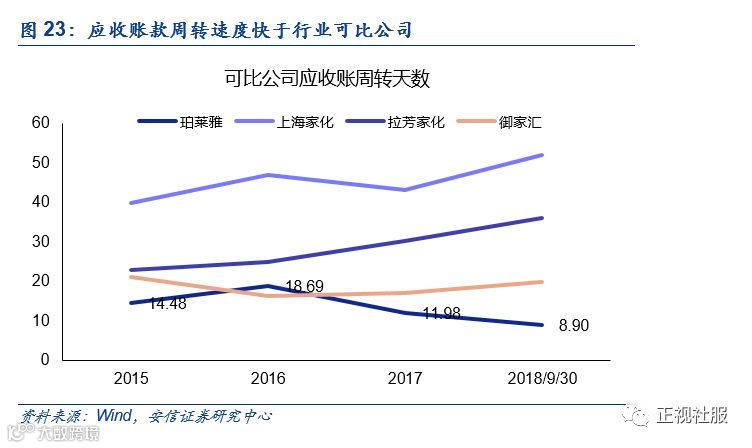 2016年起,珀莱雅应收账款周转速度持续提升,2018Q3应收账款周转天数达8.9,优于行业可比公司。