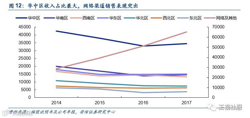 覆盖多地区网络,华中区为主要推动力。珀莱雅在华中区、华南区、西南区等多个地区铺设销售,其中华中区的收入总额表现最为突出,为其他单个地区的收入总额的两倍以上。随着互联网渗透率的提升,各地区实体店铺收入趋势略有下滑,网络渠道收入表现有明显上升趋势。
