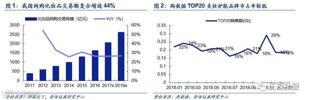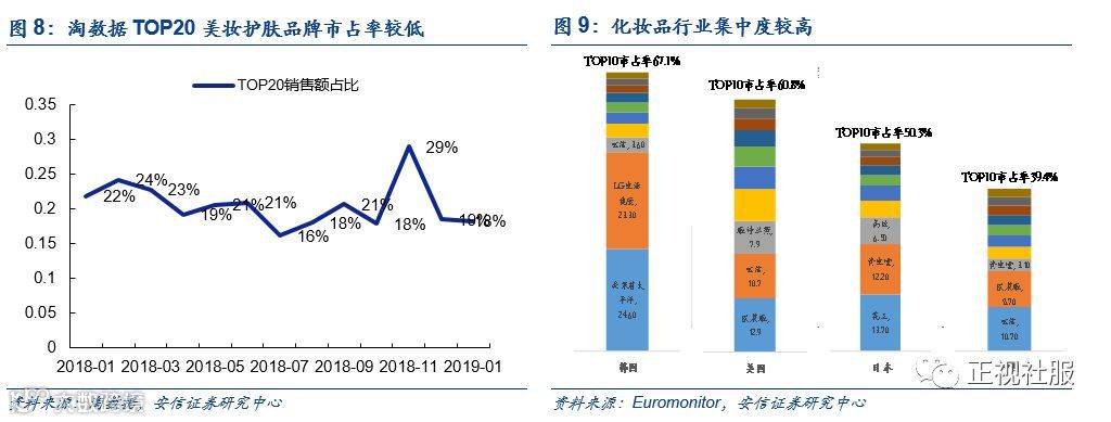 从市占率角度而言,公司提升空间极大,有望依靠品牌优势挤占杂牌市场空间。我们根据淘数据,发现2018年1-12月淘宝美妆护肤销售额前20大品牌销售额占总销售额的比例在16-30%,市场仍极为分散。考虑到化妆品行业需要极大的营销投入、打造新品需要较大的研发投入,行业必将持续集中。珀莱雅依靠品牌优势,有望持续提升市占率,挤占杂牌市场空间。