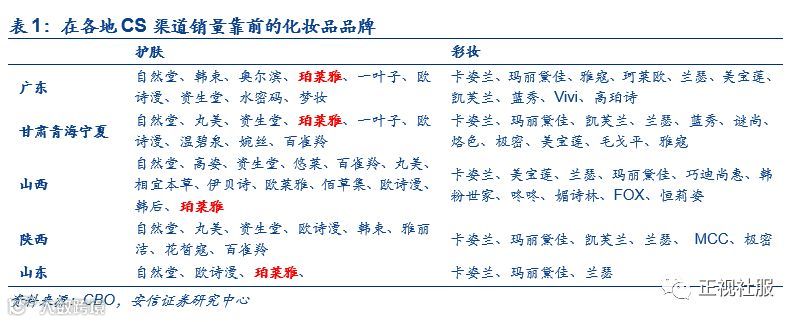 销售网络深度低线城市,在低线城市品牌深入人心。截止2017H1,公司已经构建了遍及国内30多个城市的全渠道分销网络,覆盖销售终端约1.9万家CS门店、2803家商城超市、以及206家连锁商超。根据CBO,珀莱雅品牌在调研的省份(广东、甘肃、青海、宁夏、山西、山东)中销量均位于前列。
