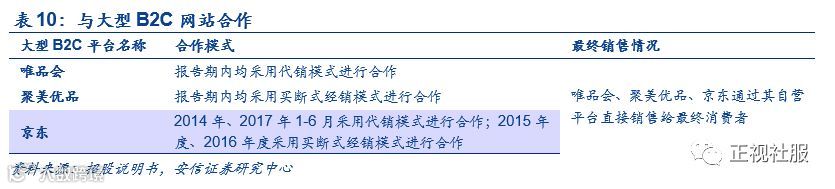 公司近年来抓住电子商务爆发式增长的契机,先后与唯品会、京东、聚美优品等国内知名大型B2C购物网站建立了密切的合作关系,分别采取经销和代销模式的模式。