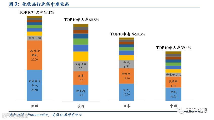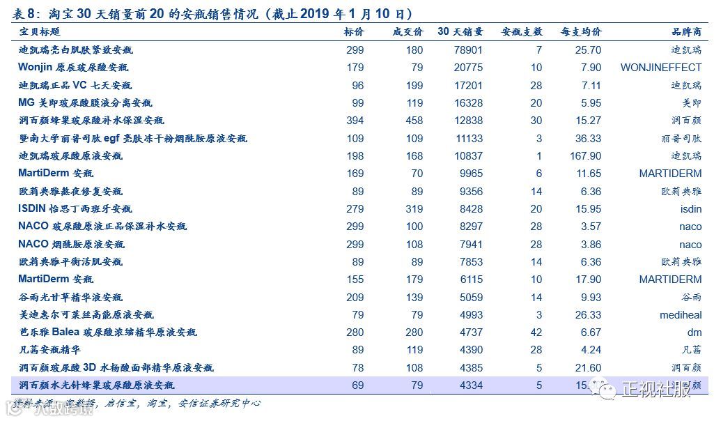 据阿里数据统计,2017年,天猫国际安瓶精华的销售额相较上一年增长了27倍。然而,不同于其他护肤品被主流大牌牢牢掌控,安瓶在市场上表现出小众品牌与国际大牌并驾齐驱的情形。我们根据淘数据,统计了截止2019年1月10日淘宝销量前20的安瓶产品,发现目前市占率较高的品牌为迪凯瑞(瑞士)、WONJINEFFECT(韩国)、美即(欧莱雅)、润百颜(华熙,中国)、丽普司肽(中国)、MARTIDERM、欧莉典雅等品牌,市场仍较为分散、且化妆品巨头尚未形成垄断,且部分本土品牌表现优异。我们认为国产化妆品有望在安瓶领域获得突破性进展,珀莱雅看准“安瓶”市场需求,2019年着力打造爆款,有望带动品牌档次提升、贡献增量业绩。