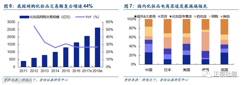 国内化妆品电商渠道发展遥遥领先,有望维持高速增长。化妆品行业传统的线下销售模式正受到流通率更高、信息传递更快、产品展示功能更丰富的电子商务模式的冲击,电子商务的爆发使线上线下零售渠道的竞争不断加剧。我国网购化妆品交易额从2009年的124.9亿元提升到2016年的1618.3 亿元,复合增速44%,远高于行业整体增速。目前国内化妆品网购渠道的发展明显领先于发达国家,到2016年国内网购渠道份额达20.6%,远高于同期日本(8.2%)、美国(8.5%)、 德国(4.2%)、英(11.0%)的水平。